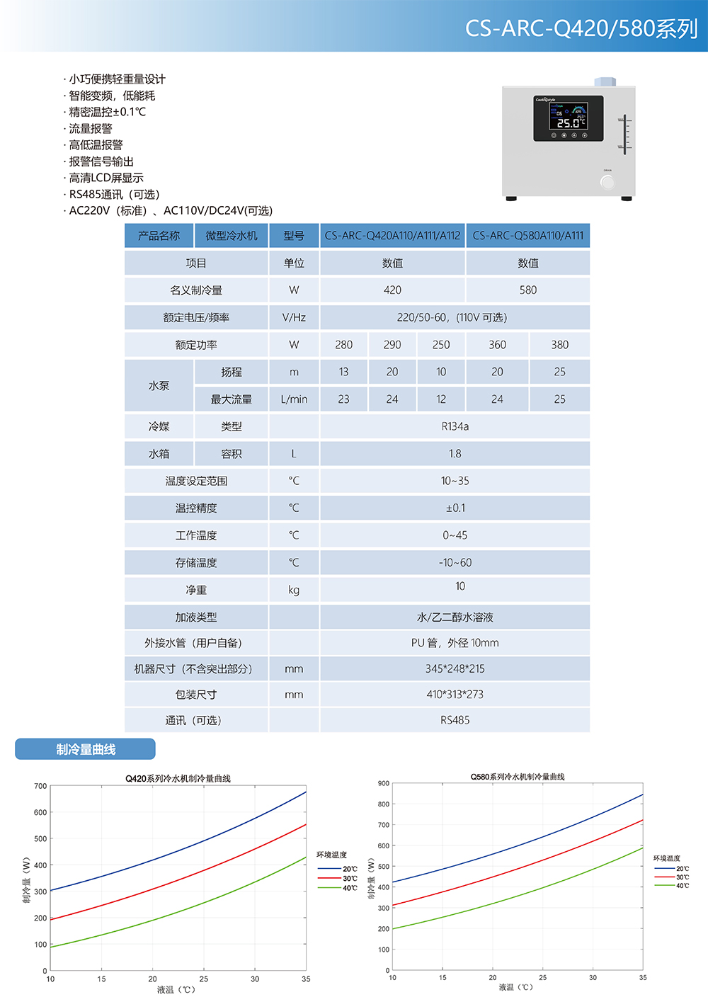 微型实验室高精度冷水机Q420/Q580产品特性: