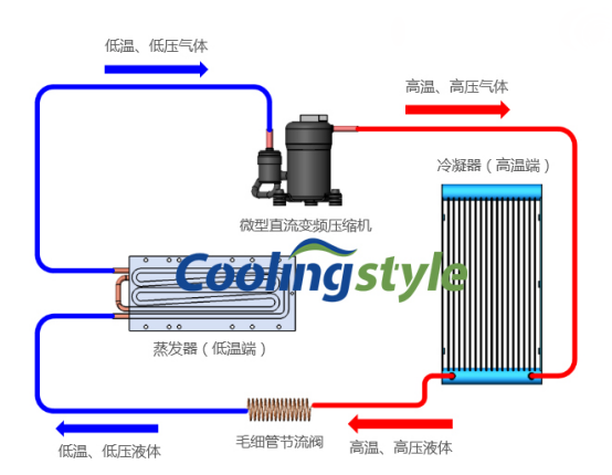 3. 蒸发制冷:液态制冷剂经过膨胀阀进入蒸发器,吸收周围热量,蒸发成气态,从而带走热量,降低激光器的温度。