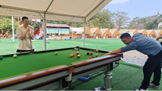 自由活动时段,营地处处洋溢着轻松惬意。大家随心选择喜爱的方式放松身心:喝下午茶闲话家常,钓鱼享悠然时光,桌球、麻将切磋乐趣,户外 K 歌尽情释放。没有工作的紧张,只有亲友相伴的松弛,同事间的距离在欢声笑语中悄然拉近,团队情谊在轻松氛围里不断升温。