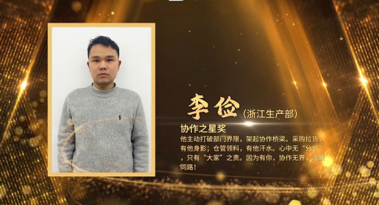 浙江酷凌时代生产部。他打破了部门的界限,更拉近了彼此的距离。帮采购拉货、助仓管领料,他总是主动跑前跑后,用忙碌的身影填补了协作的空隙。有他在,协作不再是冷冰冰的交接,而是充满默契的互助。感谢你,用热心肠温暖了大家!