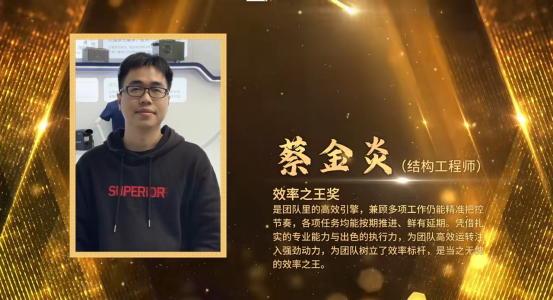 深圳酷凌时代研发部,结构工程师。他是团队里的高效引擎,兼顾多项工作仍能精准把控节奏,各项任务均能按期推进、鲜有延期。凭借扎实的专业能力与出色的执行力,为团队高效运转注入强劲动力,为团队树立了效率标杆,是当之无愧的效率之王。